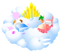 Next to the spacecraft (in the treetops), we find the white fluffy cloud home of Gabriel and Abigail. A cloud path reaches down from their cloud home toward the ground with wide steps (zigzagging upward). A safety banister follows the stairway up to their home. The inside of the angel’s home is a bedroom scene with two beds, one pink and one blue.