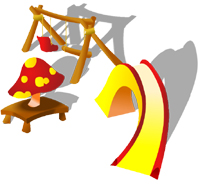 The Land of I represents a world based upon the idealism as seen through the eyes of the characters. The Land of I Forest represents the ideal community. The Land of I Forest Community is circular in dimension. At the center of the circle is the play area, the hub of daily activity, the meeting place. It's a park-like setting with shade trees, a picnic table with a mushroom umbrella, recycling trash bins, bubbling brook, slippery slide made from the Land of I rainbow arch, swing set, lush green grass and lots of flowers. A bridge crossing the stream makes the setting even more interesting.